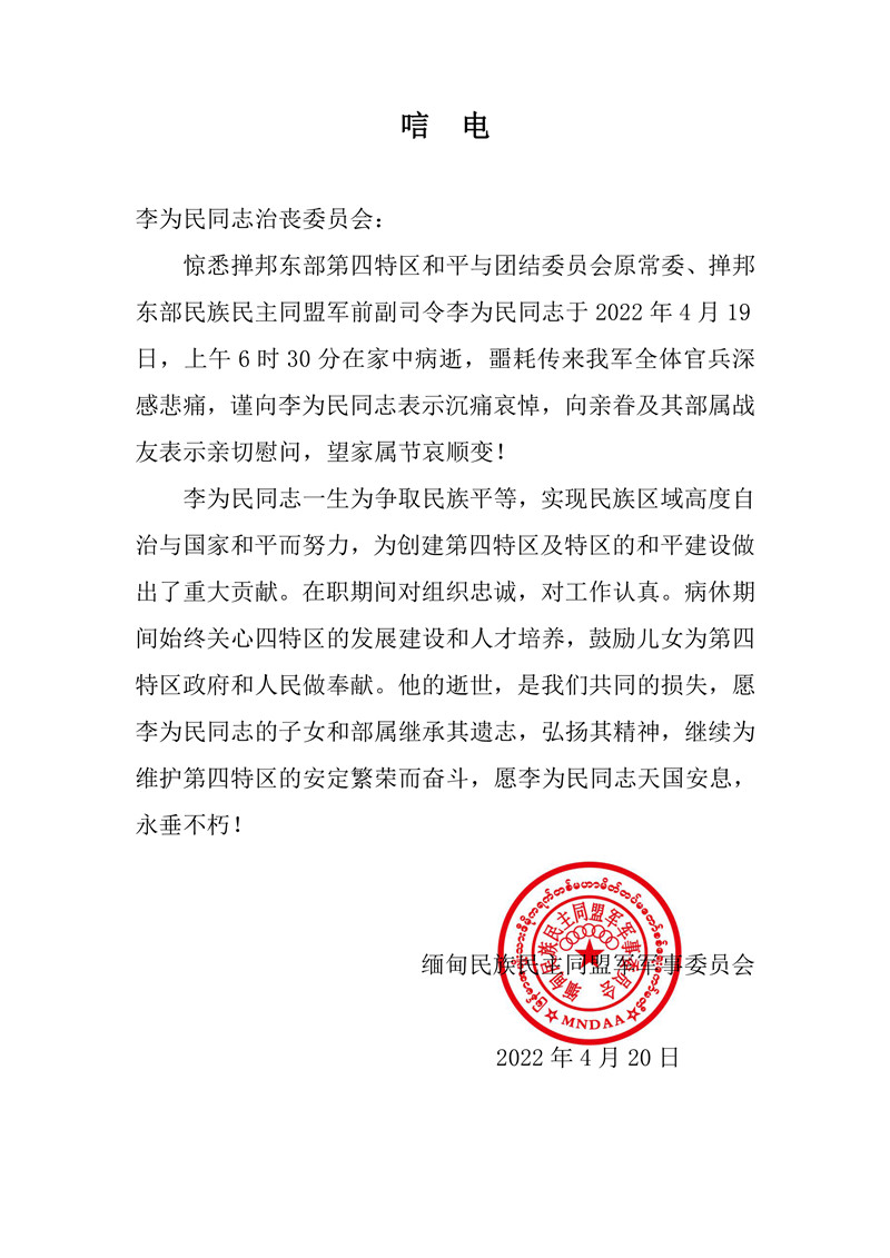 同盟军军委致掸东同盟军前副司令员李为民治丧委员会唁电