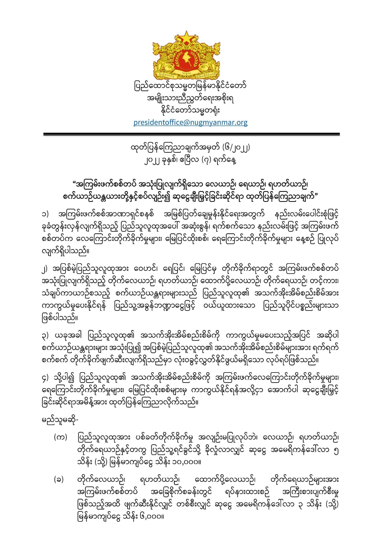 4月7日,缅甸民族团结政府(NUG)临时总统杜瓦拉希腊表示,对缅军军用战机、军舰、运输车辆实施破坏,将奖励2亿至10亿缅币。
